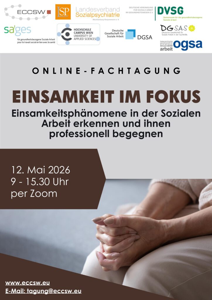 Daher lädt das European Centre for Clinical Social Work e.V. (ECCSW) am 12. Mai 2026 unter dem Motto „Einsamkeit im Fokus – Einsamkeitsphänomene in der Sozialen Arbeit erkennen und ihnen professionell begegnen“ zu einer kostenfreien Onlinefachtagung ein. Dabei sollen die gesundheitlichen Auswirkungen von Einsamkeit in der Bevölkerung und bei verschiedenen Zielgruppen der Sozialen Arbeit im Fokus stehen. Gleichzeitig werden Strategien und Interventionsformen aufgezeigt, um Einsamkeitsphänomene rechtzeitig zu erkennen und ihnen professionell zu begegnen. Die Fachtagung findet in Kooperation mit der Hochschule Campus Wien, dem Landesverband Sozialpsychiatrie Mecklenburg-Vorpommern e.V., der Österreichischen Gesellschaft für Soziale Arbeit, der Deutschen Vereinigung für Soziale Arbeit in der Suchthilfe e.V., der Deutschen Vereinigung für Soziale Arbeit im Gesundheitswesen e.V., dem Schweizerischen Fachverband für gesundheitsbezogene Soziale Arbeit und der Deutschen Gesellschaft für Soziale Arbeit e.V. statt.